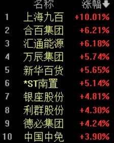 零售概念逆势拉升日昇配资,上海九百涨停,新华百货一度5连板,合百集团、银座股份、利群股份等跟涨。